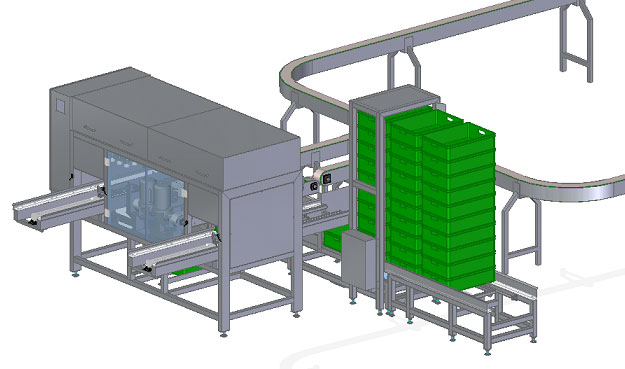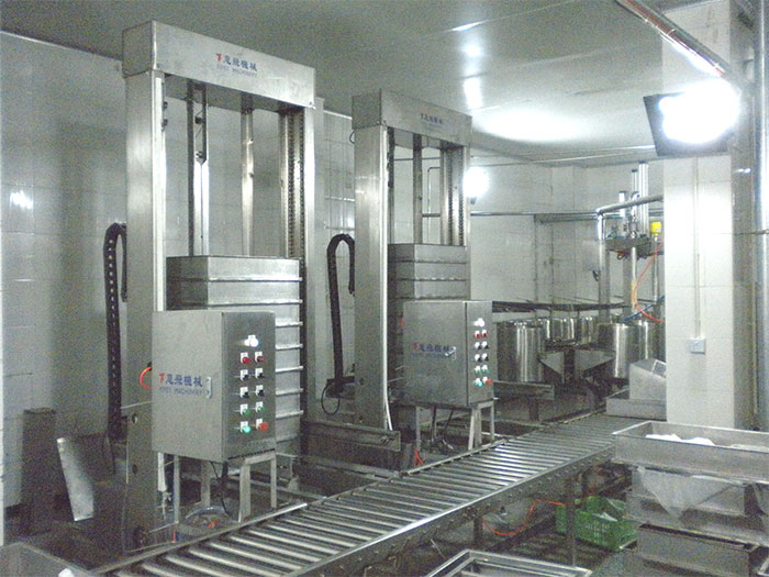機(jī)器利用機(jī)械手的原理,將從輸送機(jī)上輸送過(guò)來(lái)的已完成裝盒、封口的盒豆腐,分層裝載到周轉(zhuǎn)箱內(nèi),并傳送到指定區(qū)域。